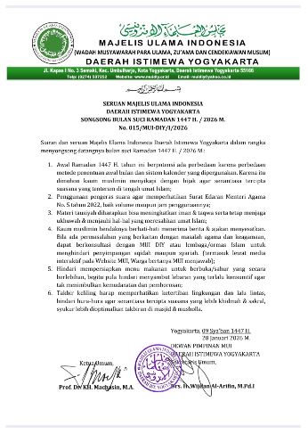 Seruan itu disampaikan di Yogyakarta, 09 Sya’ban 1447 H/ 28 Januari 2026 M oleh DEWAN PIMPINAN MAJELIS ULAMA INDONESIA, DAERAH ISTIMEWA YOGYAKARTA dan ditanda tangani oleh Ketua Umum, Prof. Dr. KH. Machasin, M.A. dan Sekretaris Umum, Drs. H. Wijdan Al-Arifin, M.Pd.I.